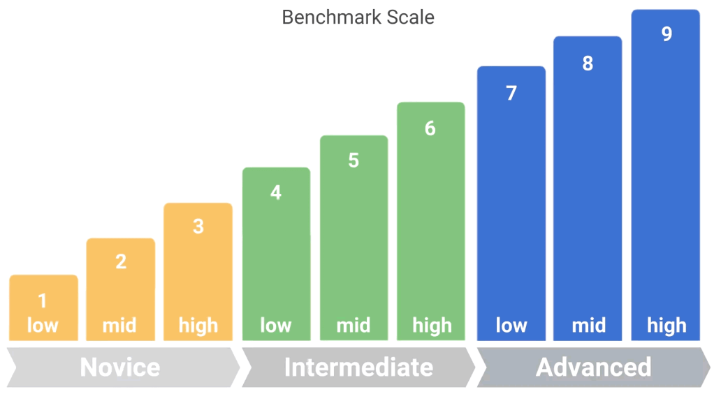 ✅ Con em ở trình độ nào: Mới bắt đầu → Trung Cấp → Cao Cấp (Novice → Intermediate → Advanced)